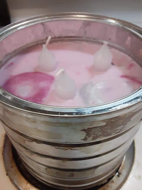 Ingredients: You will need coffee can or large soup can, coconut oil, used candle wax, tall candles to use as wicks or wicks, spoon.